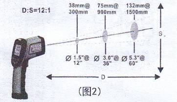 2.物距比(D:S):指测量距离与被测物体表面积的比值。如图2,当测温仪和被测物体的距离增大时,则要求被测物体的表面积更大。